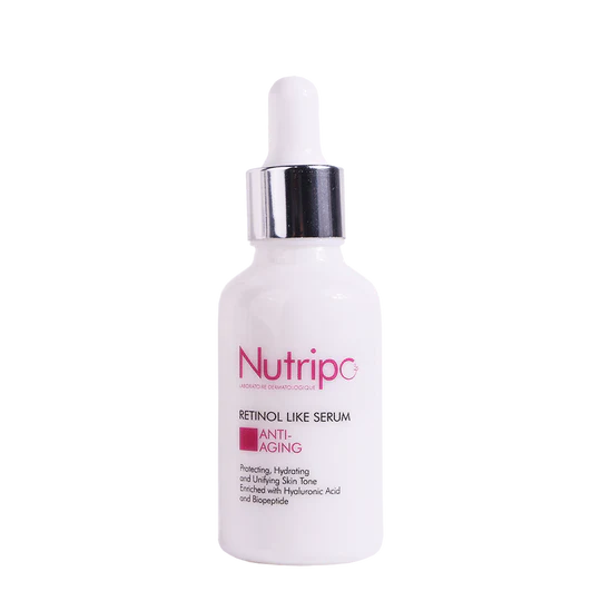 Nutripo retinol like serum is an anti-aging night serum with Vitamin A. It protects, hydrates and unifies your skin tone. Enriched with hyaluronic acid and biopeptides.